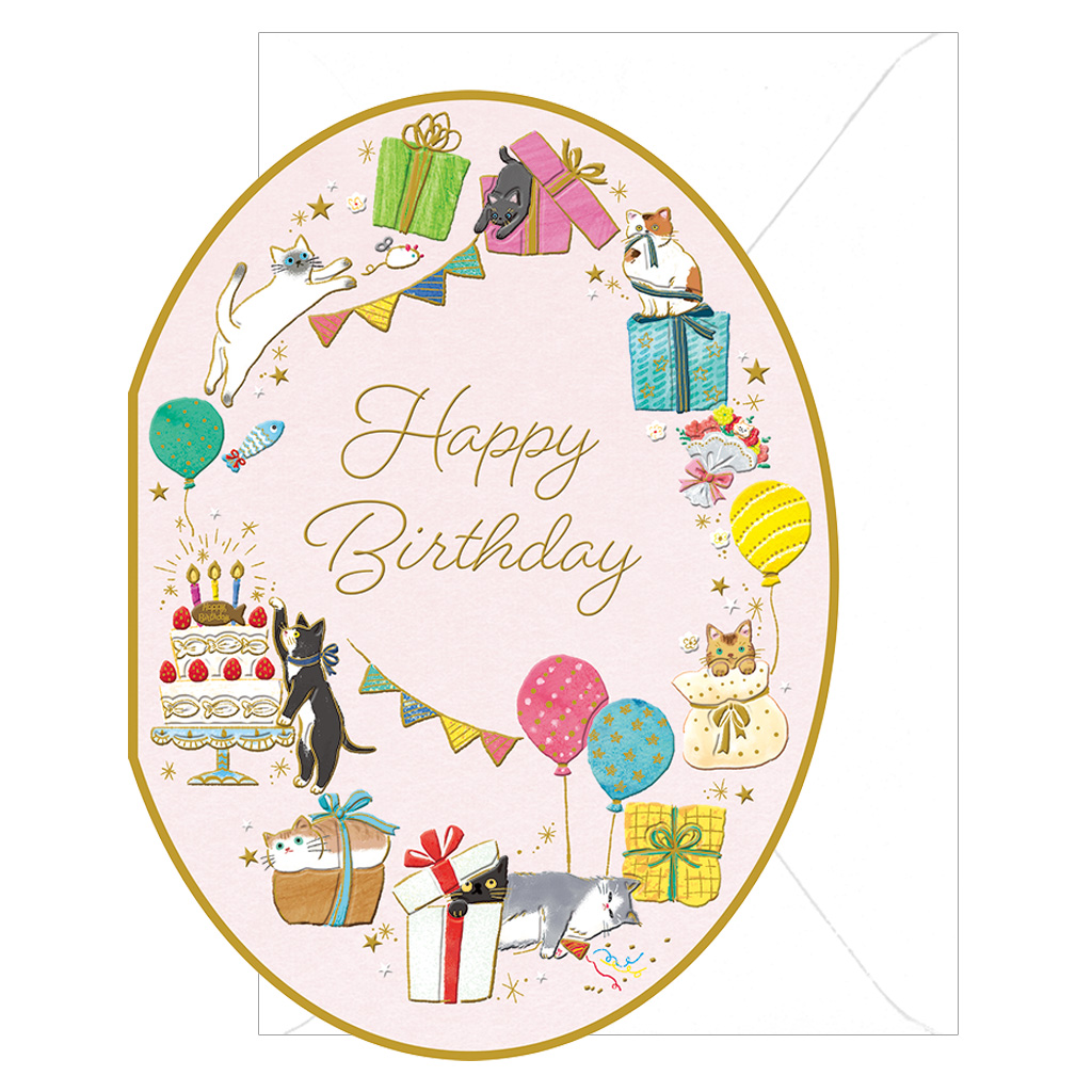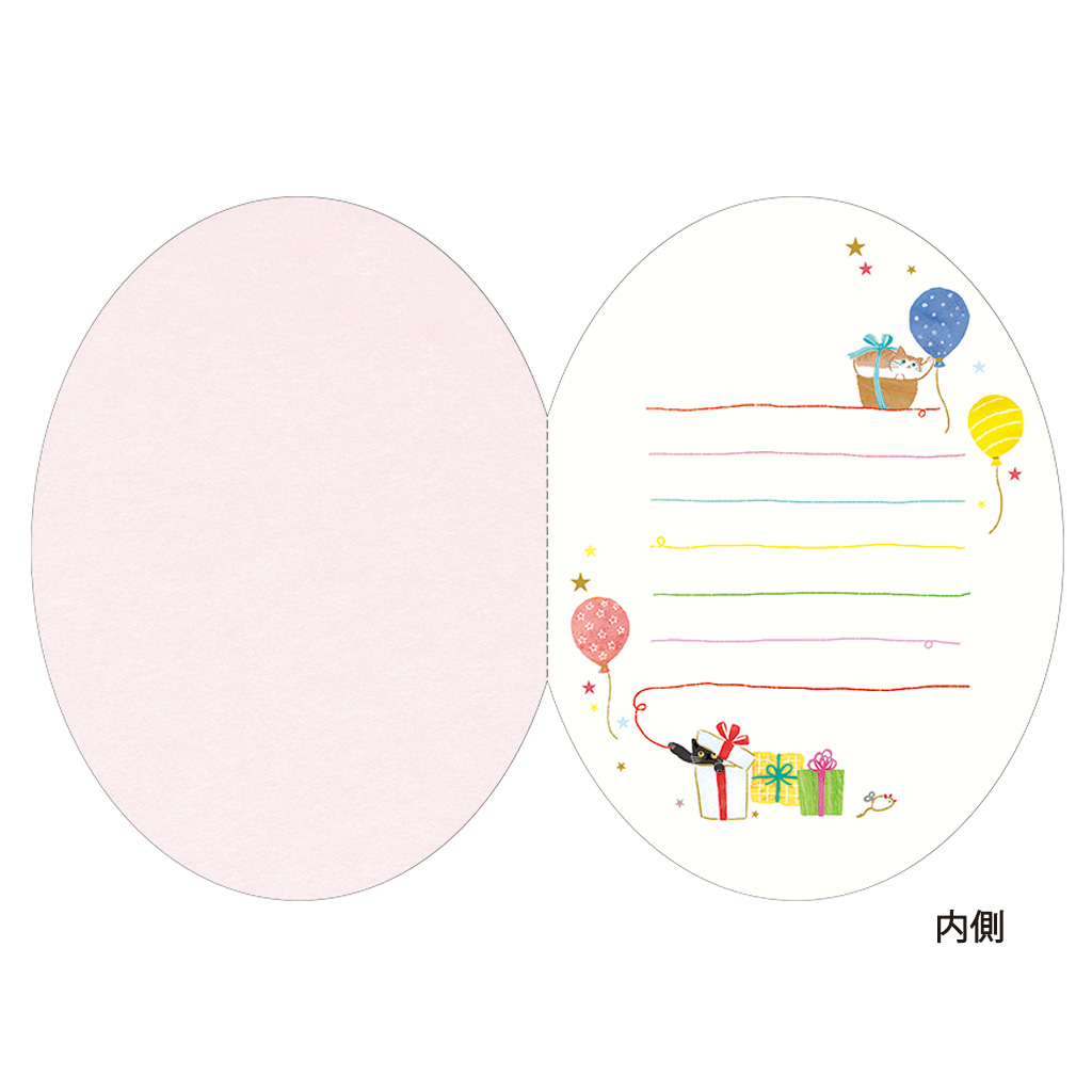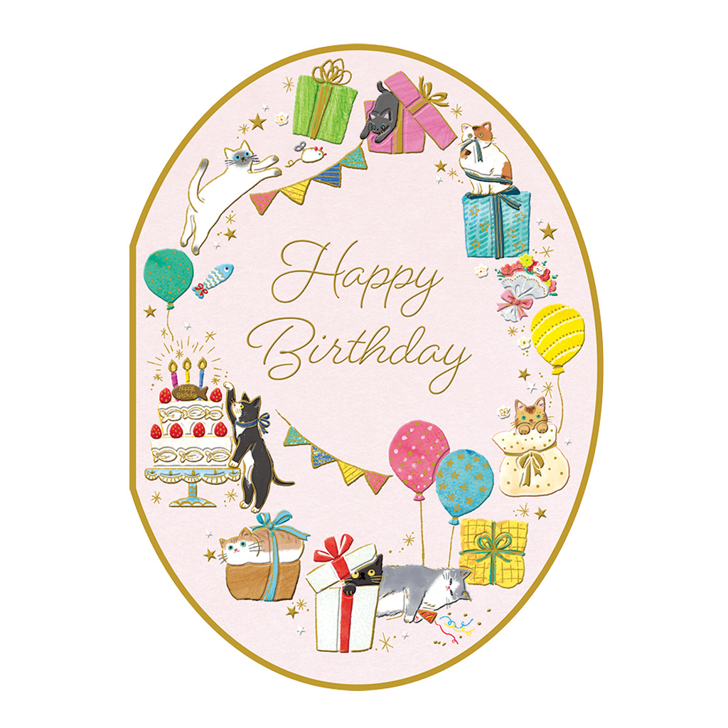 様々な種類の猫がいて、プレゼントボックスの中に隠れていたり、ケーキの上の魚形クッキーを狙っていたりとお茶目な一面が描かれています。楕円形のカードで、内側にも絵柄が入った使いやすいデザイン。メッセージが書きやすいように罫線が入っています。誕生日にもらったら嬉しいデザインです。