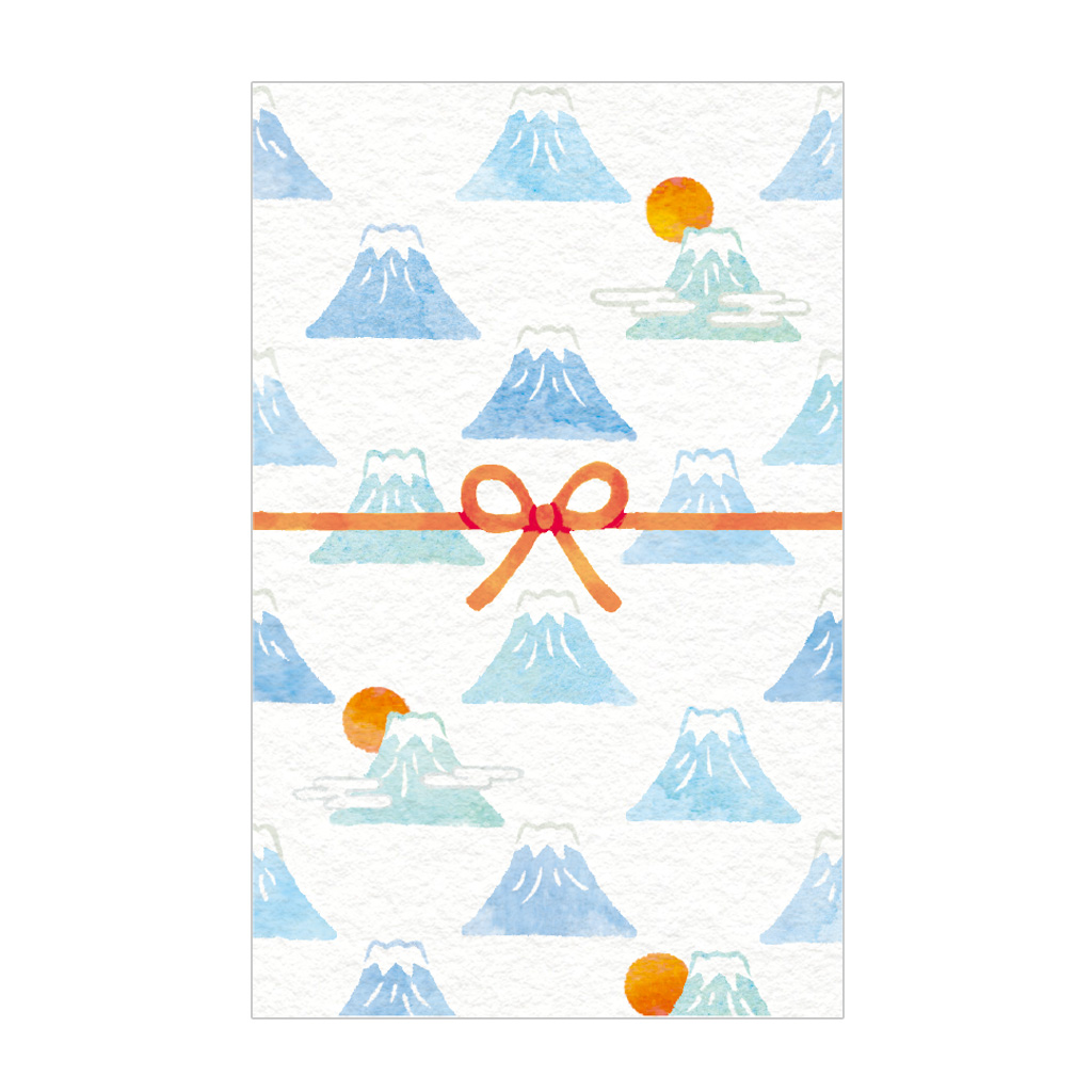 ミニサイズの富士山と水引が淡いタッチで描かれており、水色と青で爽やかな色合いになっています。富士山は時折日の出の富士山が混じっていて面白味のあるデザインです。他にはないデザインで、柄物好きの方にもおすすめです。