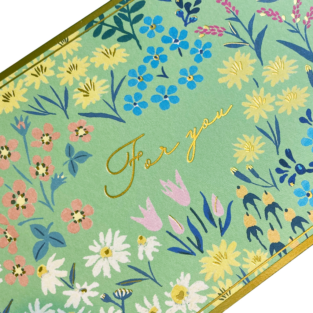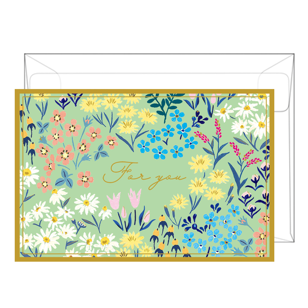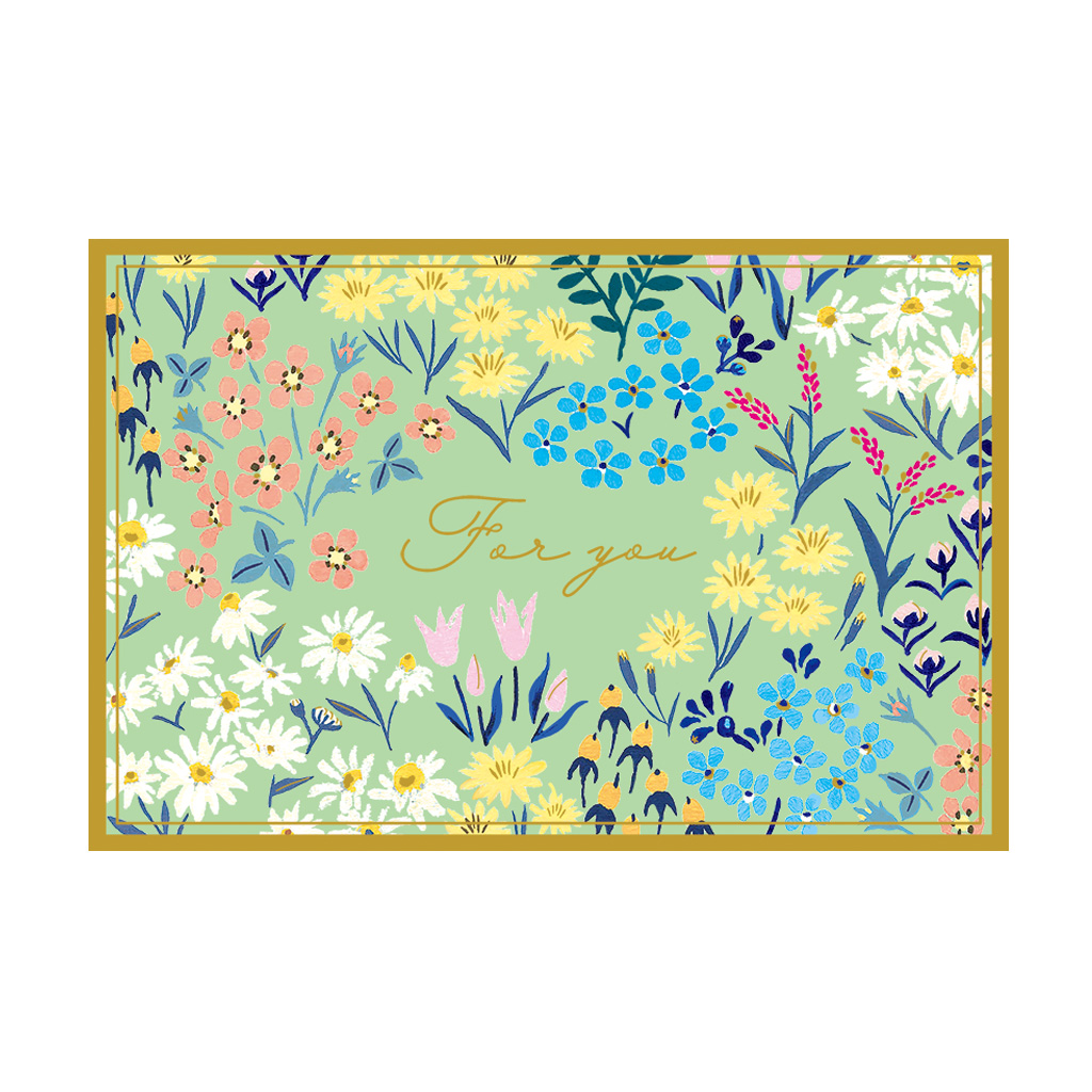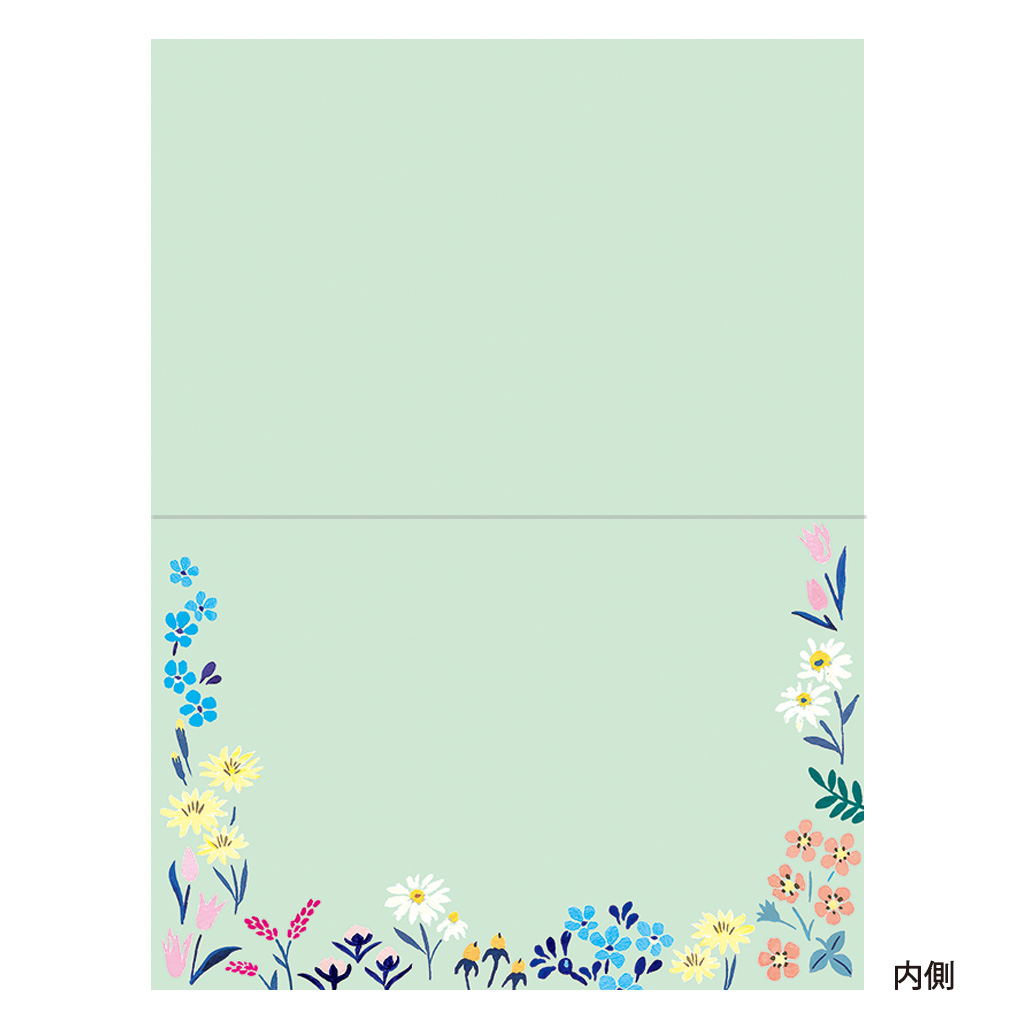 内側にも絵柄の入ったグリーンの花柄のエブリデイカードです。カードが透けて見えるトレーシングペーパーの封筒と宛名シール付き。「My Favorite Things シリーズ」使う時にうれしい『お気に入り』になる彩り豊かな花柄のシリーズです。