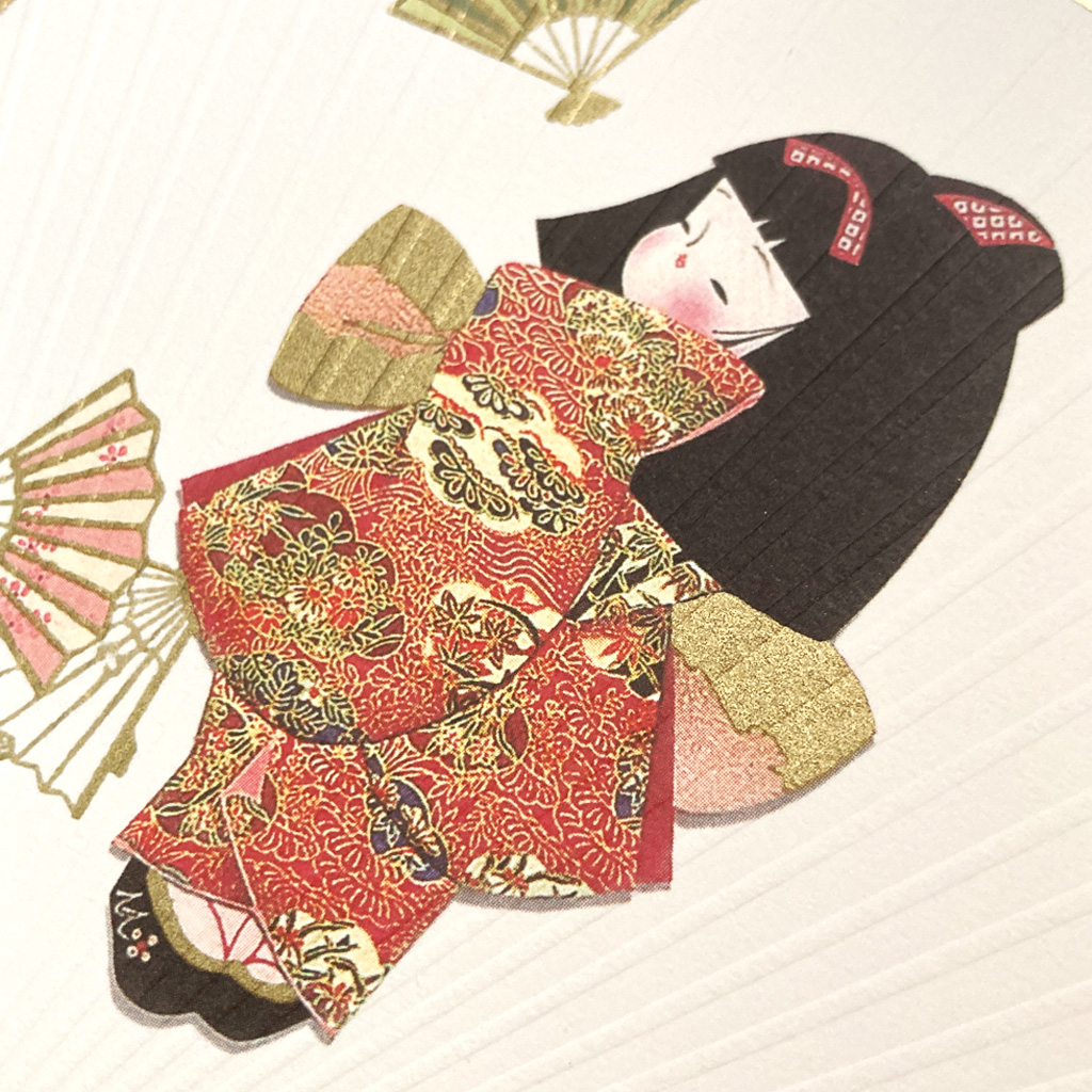 日本らしい着物を着た子供をモチーフにしたうちわ型のカードです。うちわの表と裏にエンボス加工を施してうちわの骨を表現しています。着物の細かな模様部分に金印刷を用い、うちわのへり部分にも金色をあわせることで、高級感があります。付属の定形封筒で郵送可能です(封筒とうちわの重さは約20g〜22gです。定形郵便料金が25gまでの為、他のものを同封した場合は定形郵便料金では郵送できない可能性があります。入れる場合は重さを量って確認してください。)