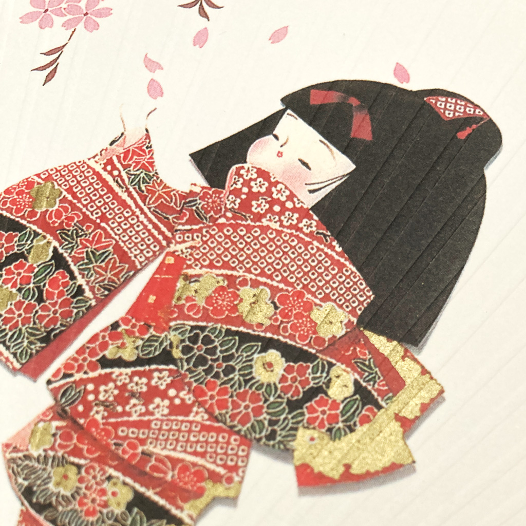 日本らしい着物を着た子供をモチーフにしたうちわ型のカードです。うちわの表と裏にエンボス加工を施してうちわの骨を表現しています。着物の細かな模様部分に金印刷を用い、うちわのへり部分にも金色をあわせることで、高級感があります。付属の定形封筒で郵送可能です(封筒とうちわの重さは約20g〜22gです。定形郵便料金が25gまでの為、他のものを同封した場合は定形郵便料金では郵送できない可能性があります。入れる場合は重さを量って確認してください。)